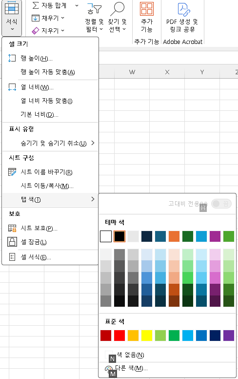 - 마우스 우클릭 → 탭 색: 시트 탭 색상 변경
